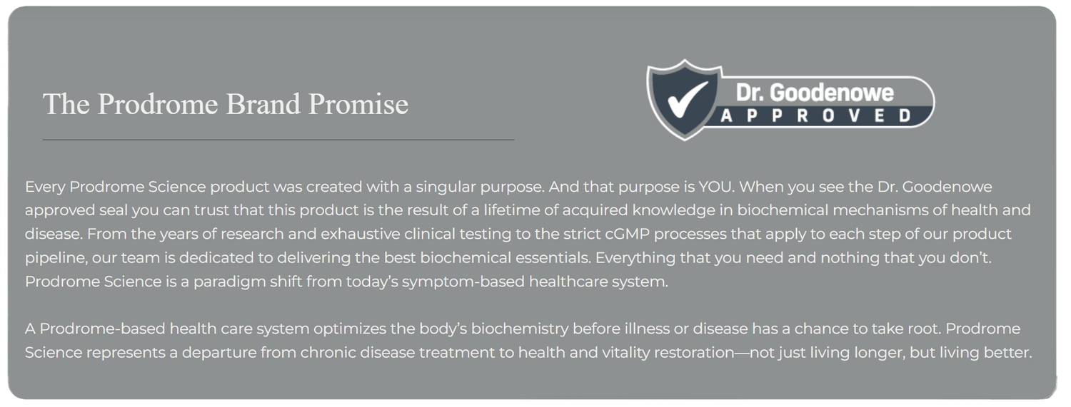 Every Prodrome Science product was created with a singular purpose. And that purpose is YOU. When you see the Dr. Goodenowe approved seal you can trust that this product is the result of a lifetime of acquired knowledge in biochemical mechanisms of health and disease. From the years of research and exhaustive clinical testing to the strict cGMP processes that apply to each step of our product pipeline, our team is dedicated to delivering the best biochemical essentials. Everything that you need and nothing that you don’t. Prodrome Science is a paradigm shift from today’s symptom-based healthcare system. A Prodrome-based health care system optimizes the body’s biochemistry before illness or disease has a chance to take root. Prodrome Science represents a departure from chronic disease treatment to health and vitality restoration—not just living longer, but living better.